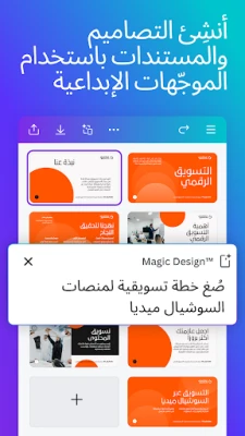 يُقدم Canva، بوابتك النهائية للإبداع البصري، تجربة تصميم رسوم بيانية وصور وفيديوهات لا مثيل لها، سواء كنت مصمماً محترفاً أو تبدأ خطواتك الأولى في عالم الفنون الرقمية. إنه يجمع بين البساطة والقوة، مما يتيح لك تحويل أفكارك إلى واقع مذهل بكل سهولة. انغمس في عالم Magic™ المدعوم بالذكاء الاصطناعي، حيث تتخذ التصميمات بعداً جديداً من التميز. مع ميزات مثل Magic Design التي تُنشئ لك تصاميم من مجرد صورة، وMagic Edit لتعديل أي جزء من صورك بلمسة سحرية، بالإضافة إلى Magic Eraser لإزالة العناصر غير المرغوبة، وTranslate لترجمة إبداعاتك إلى أكثر من 100 لغة، فإن Canva يضع قوة الابتكار بين يديك.