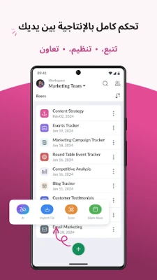حوّل جهازك الذي يعمل بنظام Android إلى مركز قيادة بيانات متكامل مع Zoho Tables. يمكنك تعزيز كفاءتك عبر إضافة القواعد الأكثر استخدامًا مباشرةً إلى شاشتك الرئيسية للوصول السريع، واستغلال الإجراءات السريعة لفتح مساحات العمل الحديثة أو إدخال سجلات جديدة بلمسة زر، أو حتى البحث الفوري داخل بوابتك. لتبقى منظمًا، توفر لك الأداة المصغرة على الشاشة الرئيسية قائمة واضحة بالقواعد، لتكون بياناتك الهامة على بعد نقرة واحدة. ومع Zoho Tables، أصبح تنظيم بياناتك وتخطيط مهامك أمرًا سهلاً، من خلال الجداول المخصصة والسجلات المرتبطة وأكثر من 20 نوعًا من الحقول التي تضمن لك إيجاد كل ما تحتاجه في ثوانٍ.